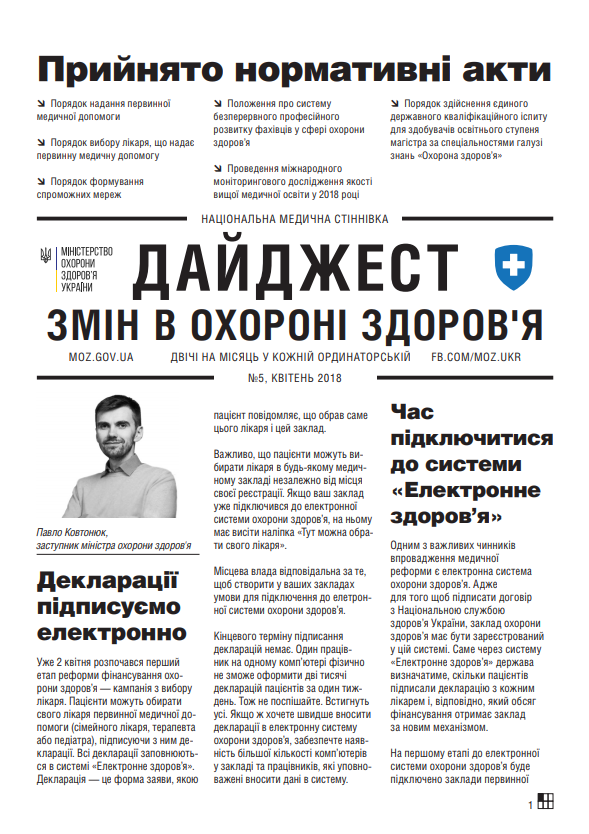 Дайджест змін в охороні здоров’я 5 Опублікував(ла) med1 , 10 Квітня 2018 року. Опубліковано в Реформа МОЗ. Дайджест змін в охороні здоров’я « Назад Вперед »