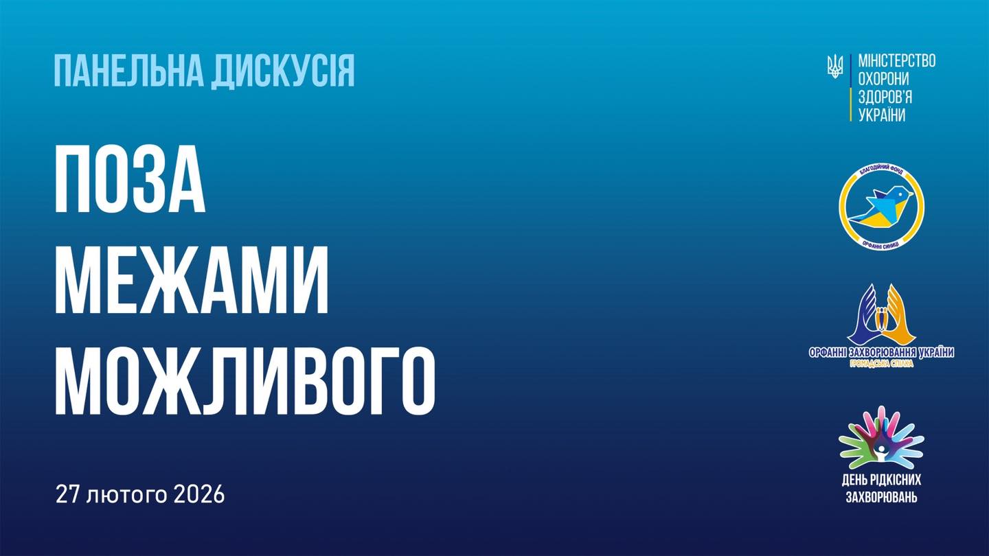 Панельна дискусія «ПОЗА МЕЖАМИ МОЖЛИВОГО», що відбудеться 27 лютого 2026 року в м. Києві із залученням представників ERN, європейських лікарів та пацієнтських спільнот, представників української влади, Національної служби здоров’я України, Державного підприємства «Медичні закупівлі України», представників Департаментів/Управлінь охорони здоров’я обласних/міських державних адміністрацій, представників виробників інноваційних ліків, лікарів-експертів реферетних центрів.